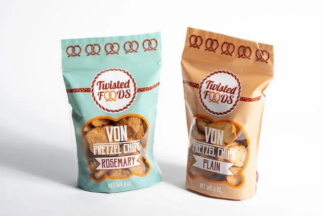 Twisted Foods VON Pretzel Chips are seasoned with Rosemary, EVOO and Pretzel Salt or just plain EVOO and Pretzel Salt. Each case contains 12 retail ready, 5oz bags of crunchy deliciousness that have a 6 month shelf life. They never last that long on your shelves, however. Once your customers taste them they keep coming back for more!